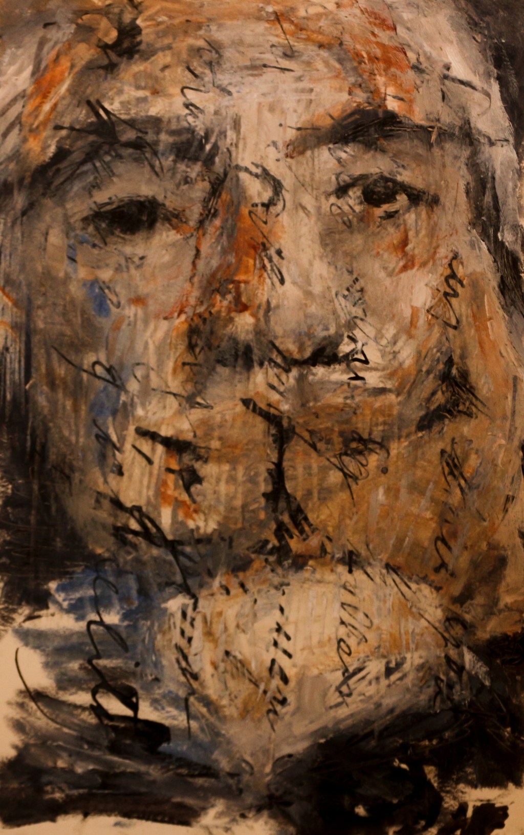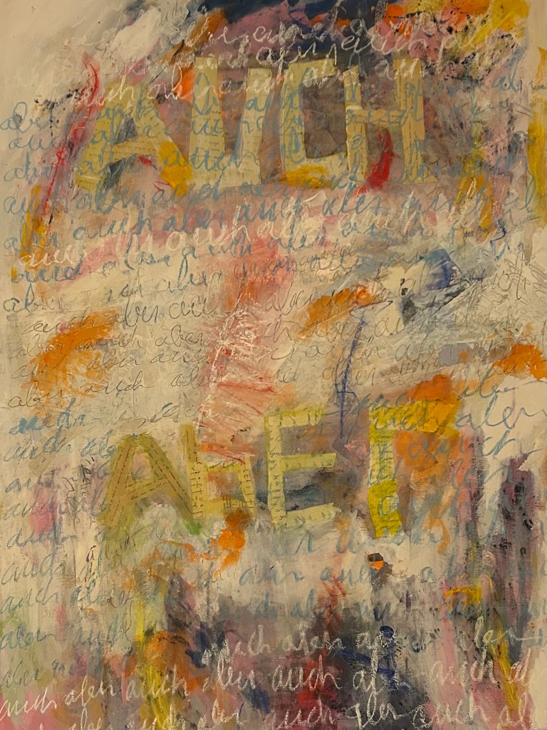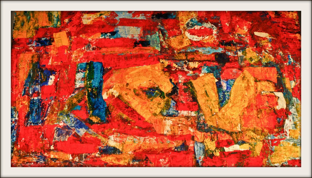 —-Surveillance, isolation, and ideological fragmentation are alluded to themes in the painting, “Ostagia.” The main figure visually and emotionally cut off from the rest of the canvas mirrors how individuals were estranged within surveillance states, fearful of both their governments and their neighbors. The background is dominated by the stark tricolor of black, red, and yellow, strongly recalling the German flag—here distorted and fragmented. This implies a specific geopolitical context: the division of Germany as a central stage for Cold War tensions. With brushwork that is jagged, chaotic, and frenetic. Red and black blotches erupt against a yellow field like ideological flare-ups—violent, uncontainable, and unresolved.
