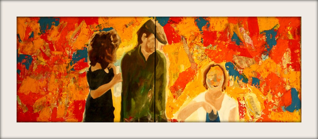 Fragments of the scores are surrounded by colors and imagery from the 20th-century that solicit awareness of political upheaval and its impact on the individual. The patchwork of bright, clashing colors (red, orange, yellow) symbolizes both celebration and chaos. This tension mirrors the post-1989 disorientation and the paradox of liberation interwoven with dislocation. These textual textures are not mere decoration. Music—a language often seen as universal—here becomes fragmented. This suggests that even shared cultural mediums cannot resolve the discontinuities imposed by political history. The figures are rendered in muted, earthy colors, making them appear absorbed or overwhelmed by their surroundings. The background threatens to engulf them, suggesting individuals being lost in the spectacle or narrative of state-driven “unification.”